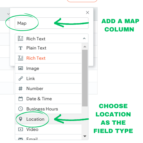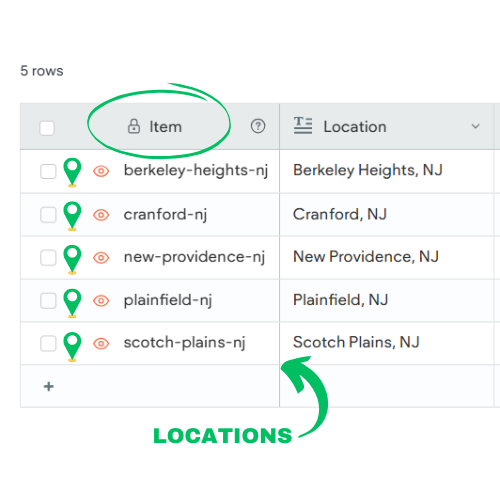 When working with internal collections, your “Item” might set to be either a keyword or a location. If your items are locations, make sure to include a column for the map when building your collection. This ensures each location has a corresponding map ready for its specific landing page when connecting your data. Below is a quick visual guide on how to set up the map column.