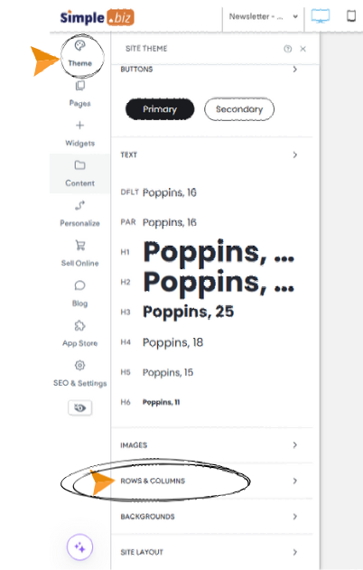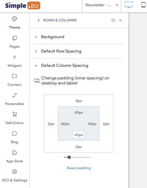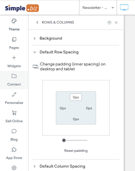 For seamlessly consistent row and column formatting across your entire website, check your template's global Design Settings. Adjusting these settings FROM THE START will ensure that your rows and columns are padded and spaced evenly, elevating the entire design as well as the professionalism of the website.