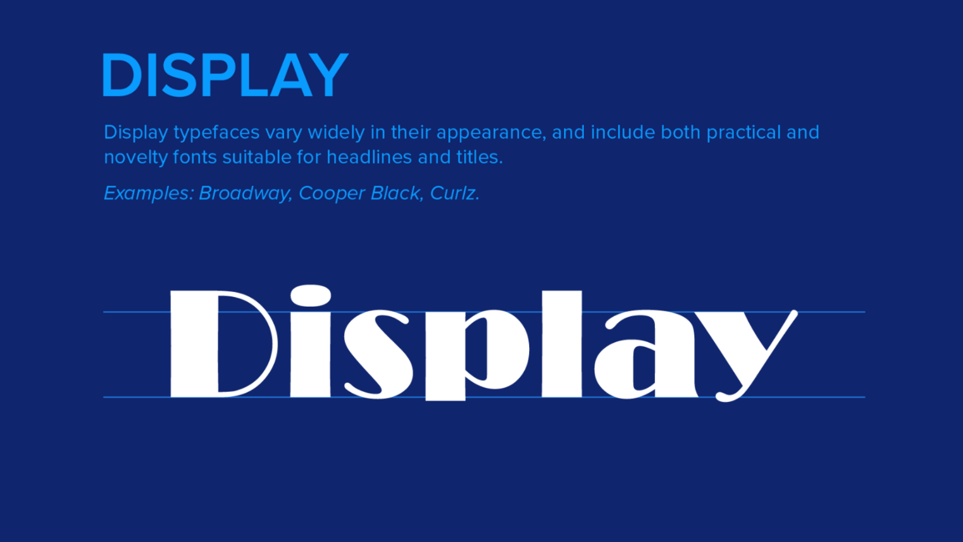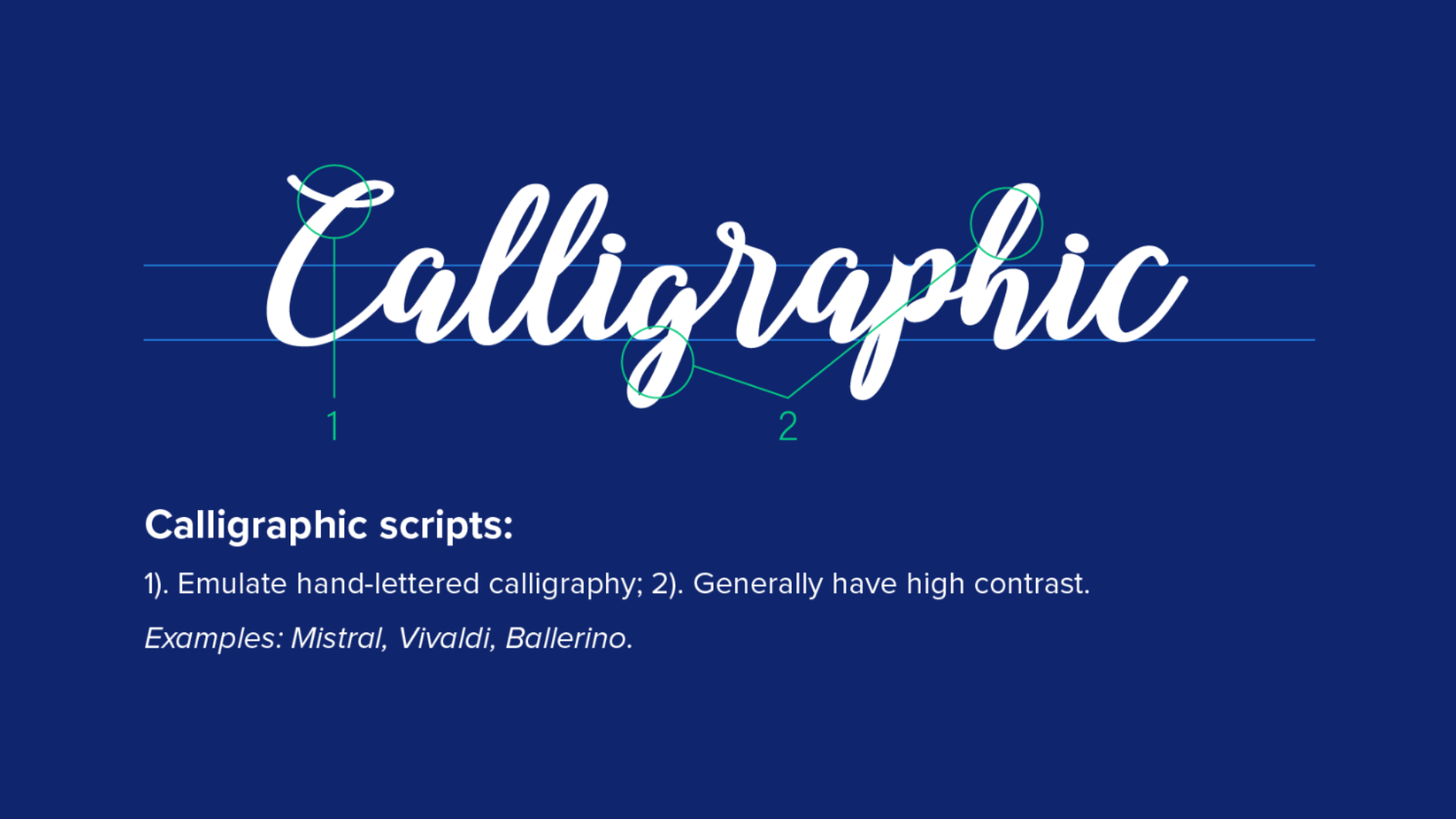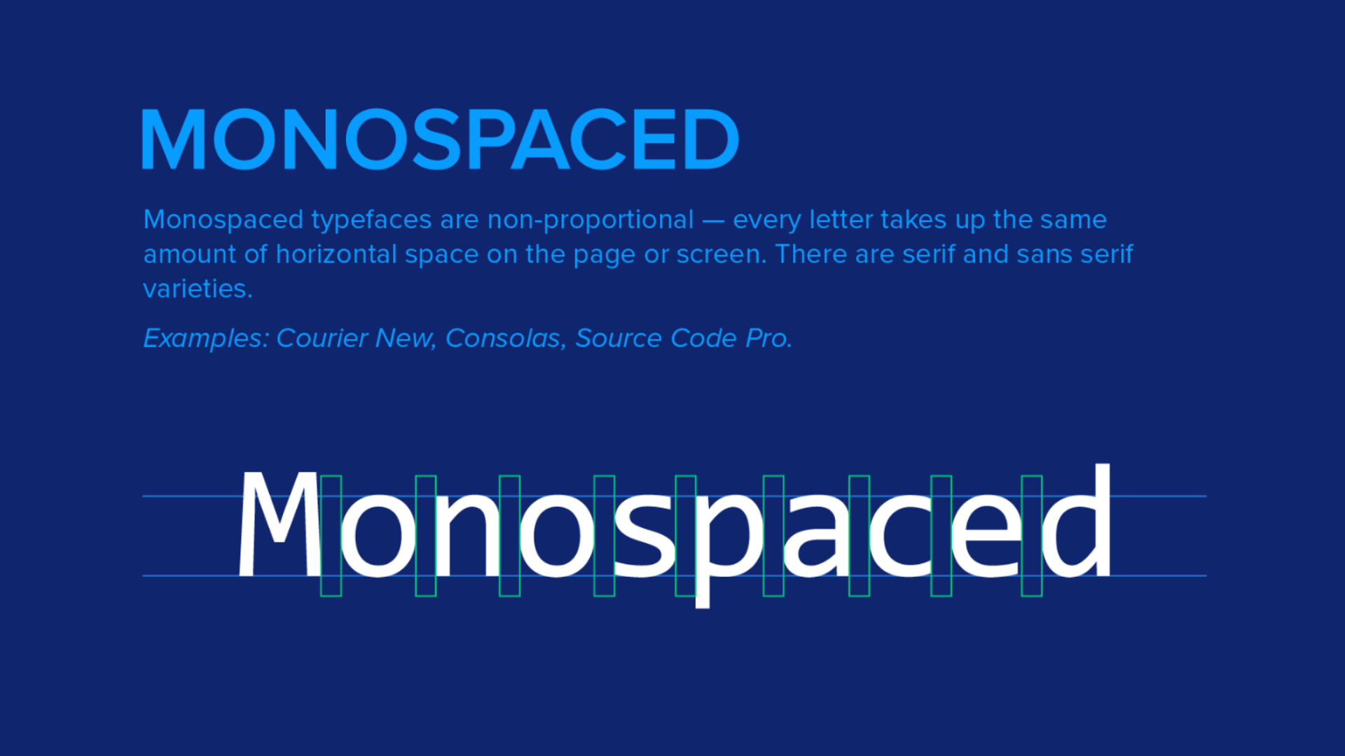 Serif, Sans-Serif, Script, Monospaced, and Display. Each type of font should be chosen based on the