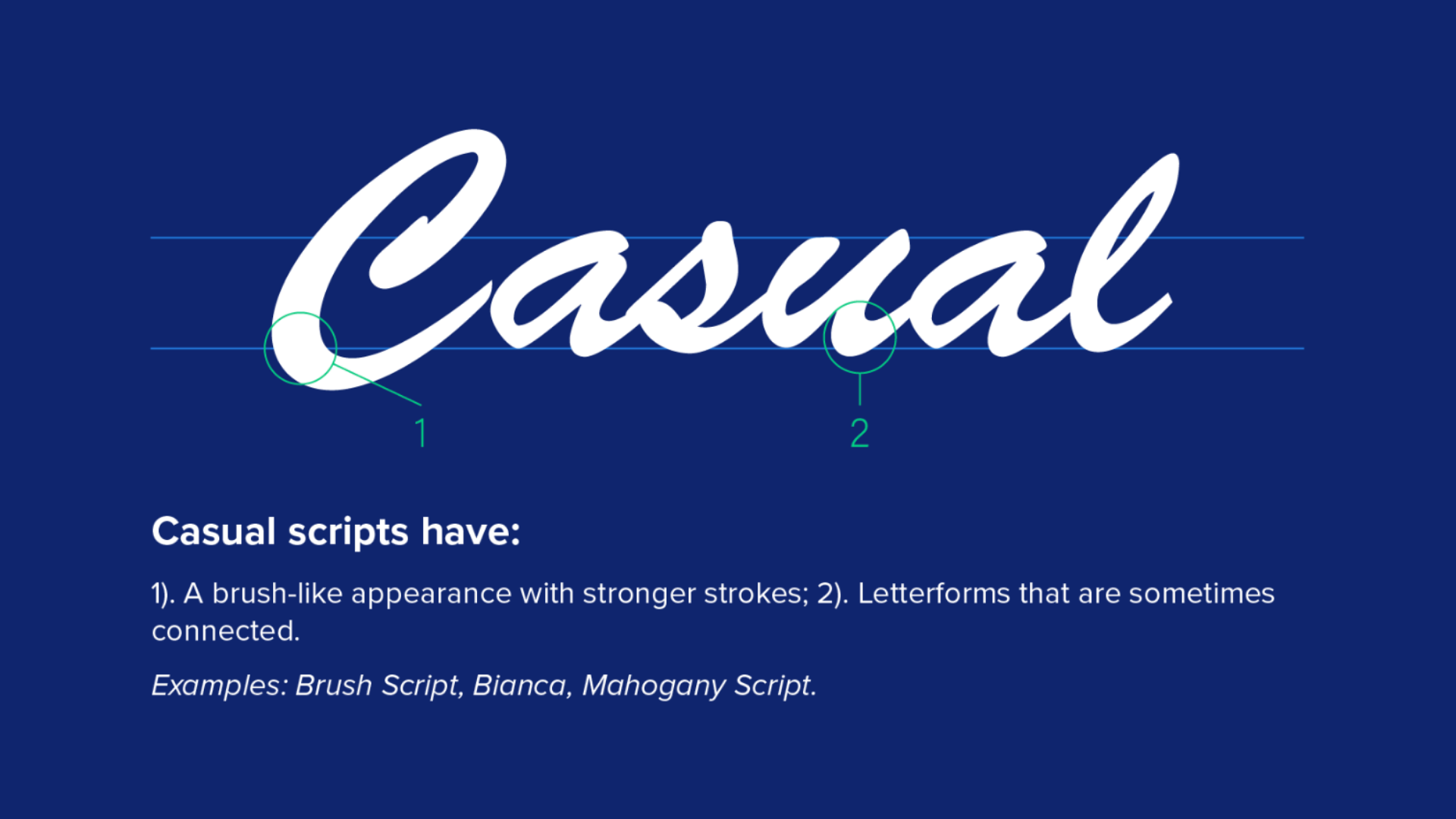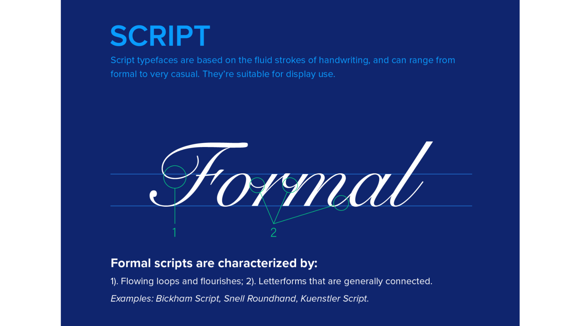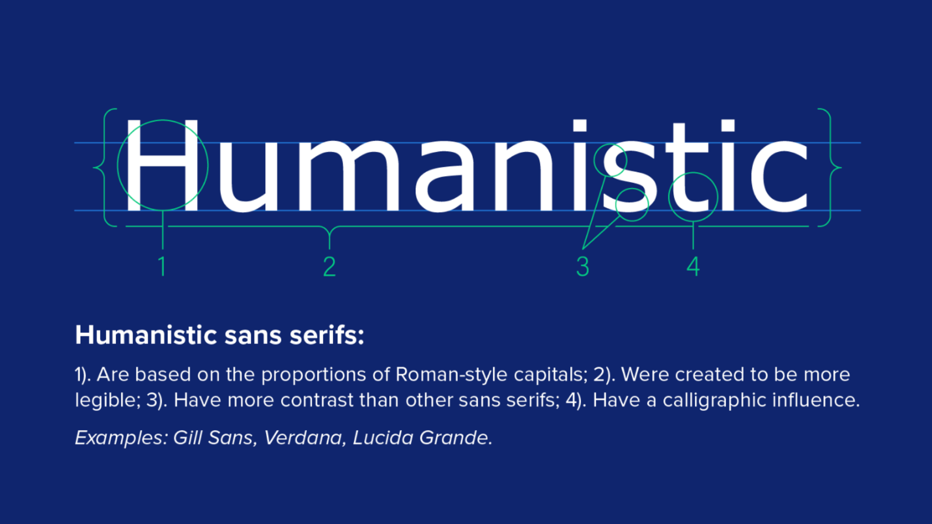 Serif, Sans-Serif, Script, Monospaced, and Display. Each type of font should be chosen based on the
